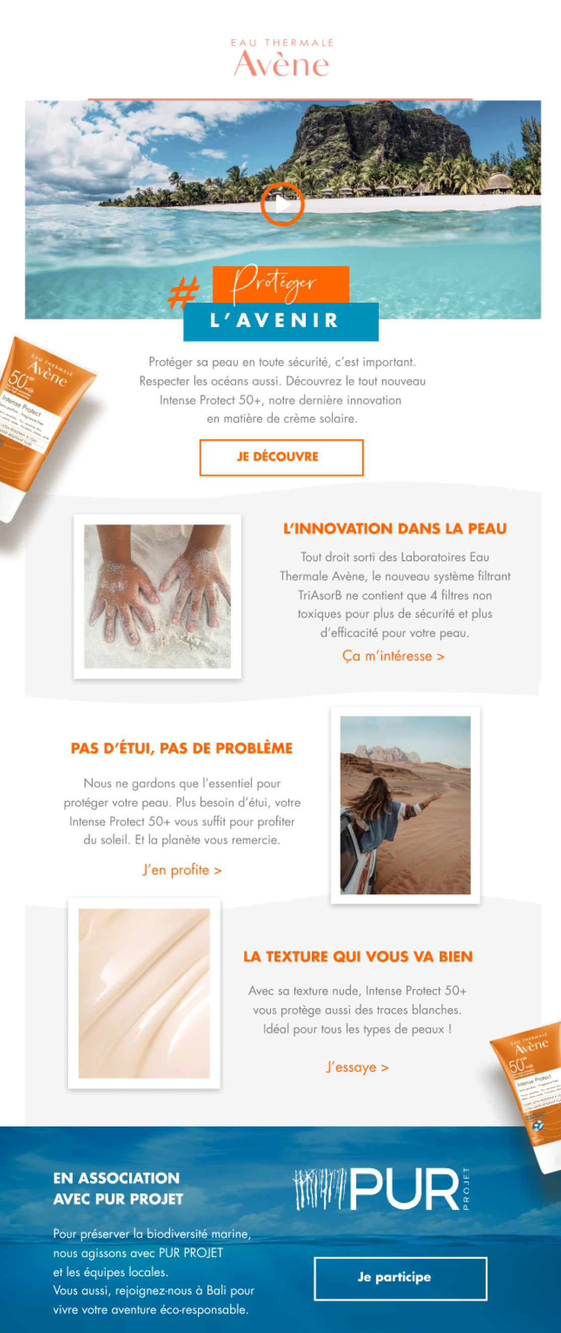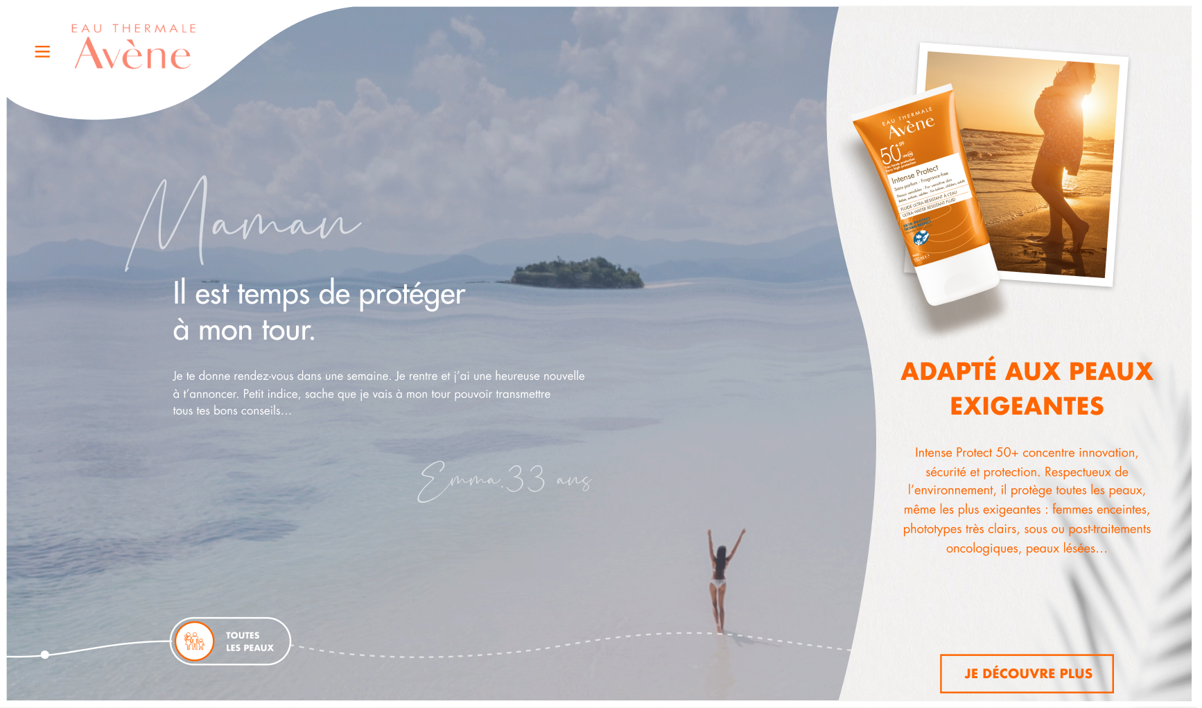 Avène souhaite mettre en avant les caractéristiques de son nouveau produit solaire, ainsi que sa composition respectueuse de l'environnement. Le film promotionnel est décliné en une expérience digitale novatrice, mettant en scène l'évolution d'une petite fille partageant ses expériences avec sa mère à travers plusieurs tableaux. Cette narration permet de mettre en lumière les spécificités du produit, tandis que la petite fille, devenue mère à son tour, incarne la transmission des valeurs de la marque.